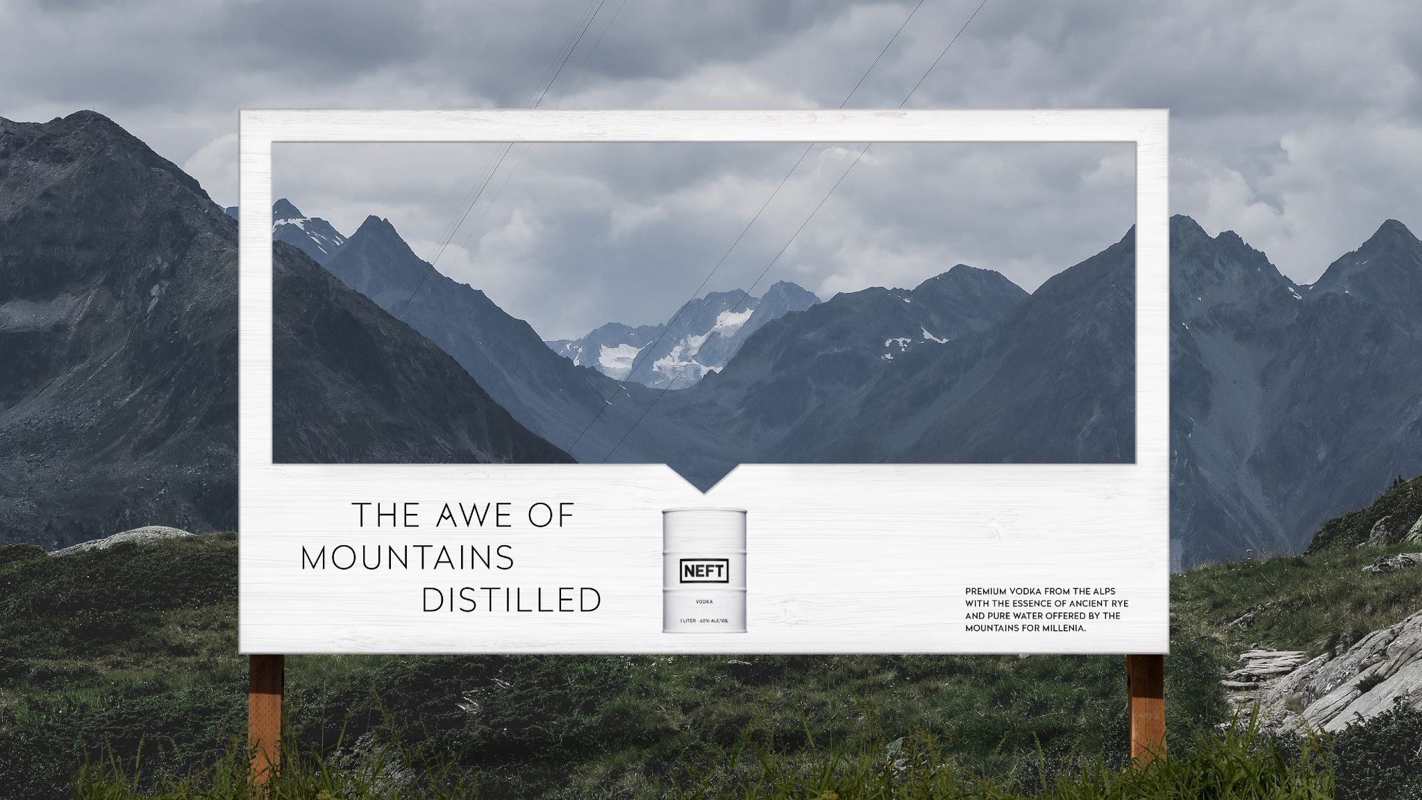 Key part of the identity system is a graphic frame device. It is inspired by the frame of the NEFT logo and is an ode to distilling the majesty of the Alps into the vodka itself. The device flexes accordingly to provide coherence across touchpoints.