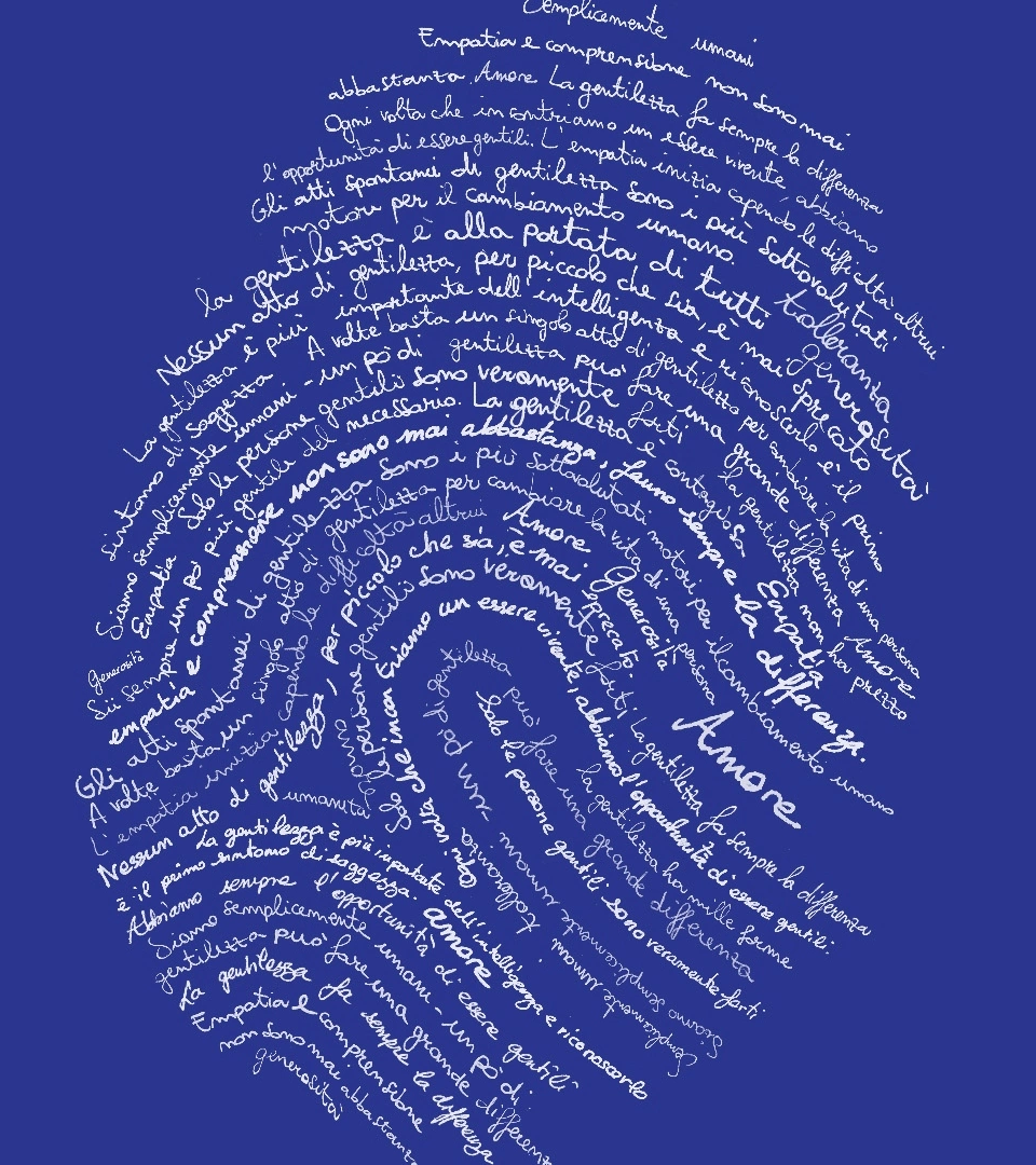 A typographic fingerprint formed by handwritten phrases about the unique kindness and empathy of each human being.